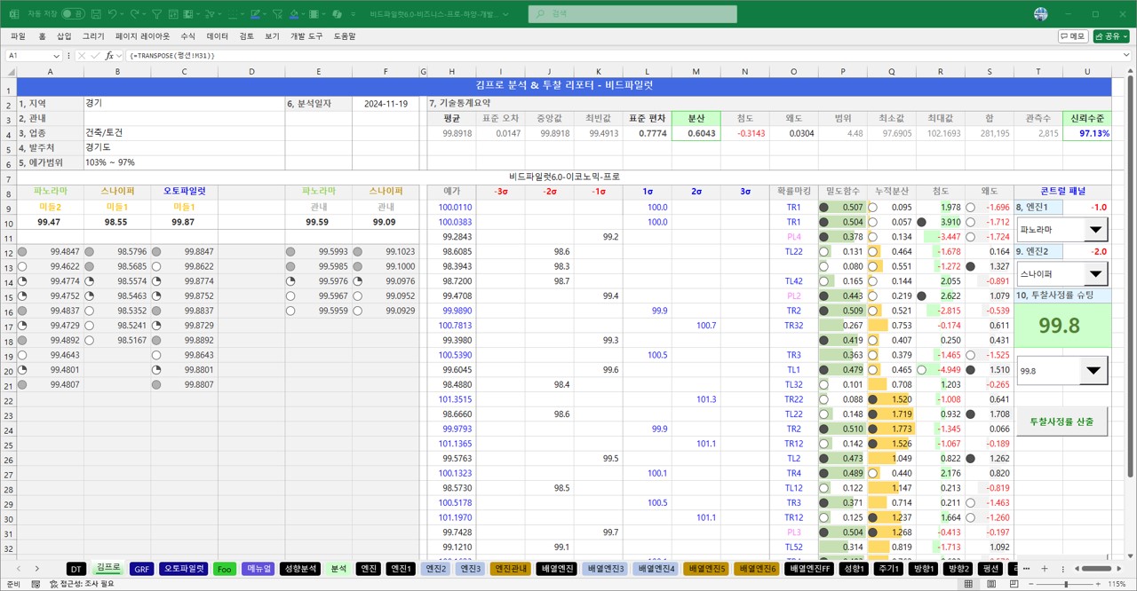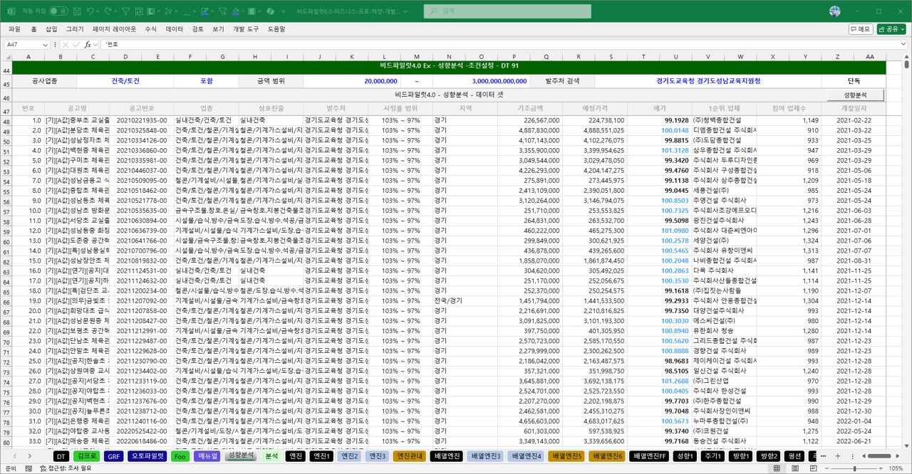 분석서비스 회사의 프로그램은 화려하지만  맞춤공고관리, 투찰함등 입찰관리부문이 90%, 분석서비스가 10%로 구성되어 있습니다.  비드파일럿Ex는 100% 예가분석에 관한 솔루션입니다.